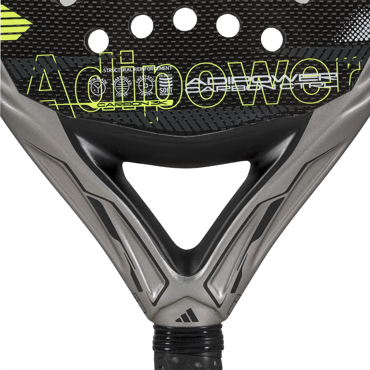 Материалы премиум‑класса: лицевые слои из карбона 18K обеспечивают чёткий отклик и ресурс, а продуманная схема отверстий Smart Holes Curve помогает легче «вгрызаться» в мяч и добавлять спин.